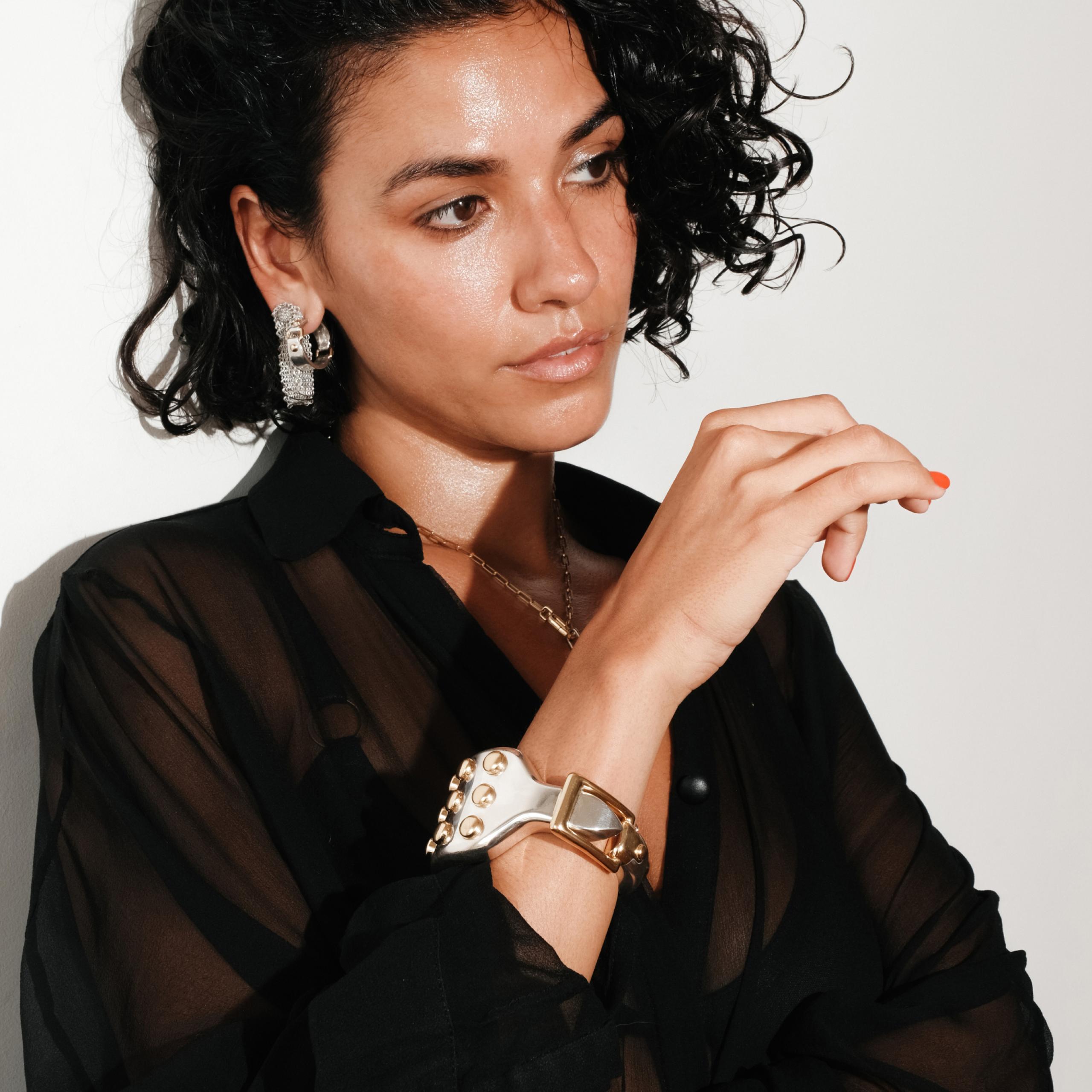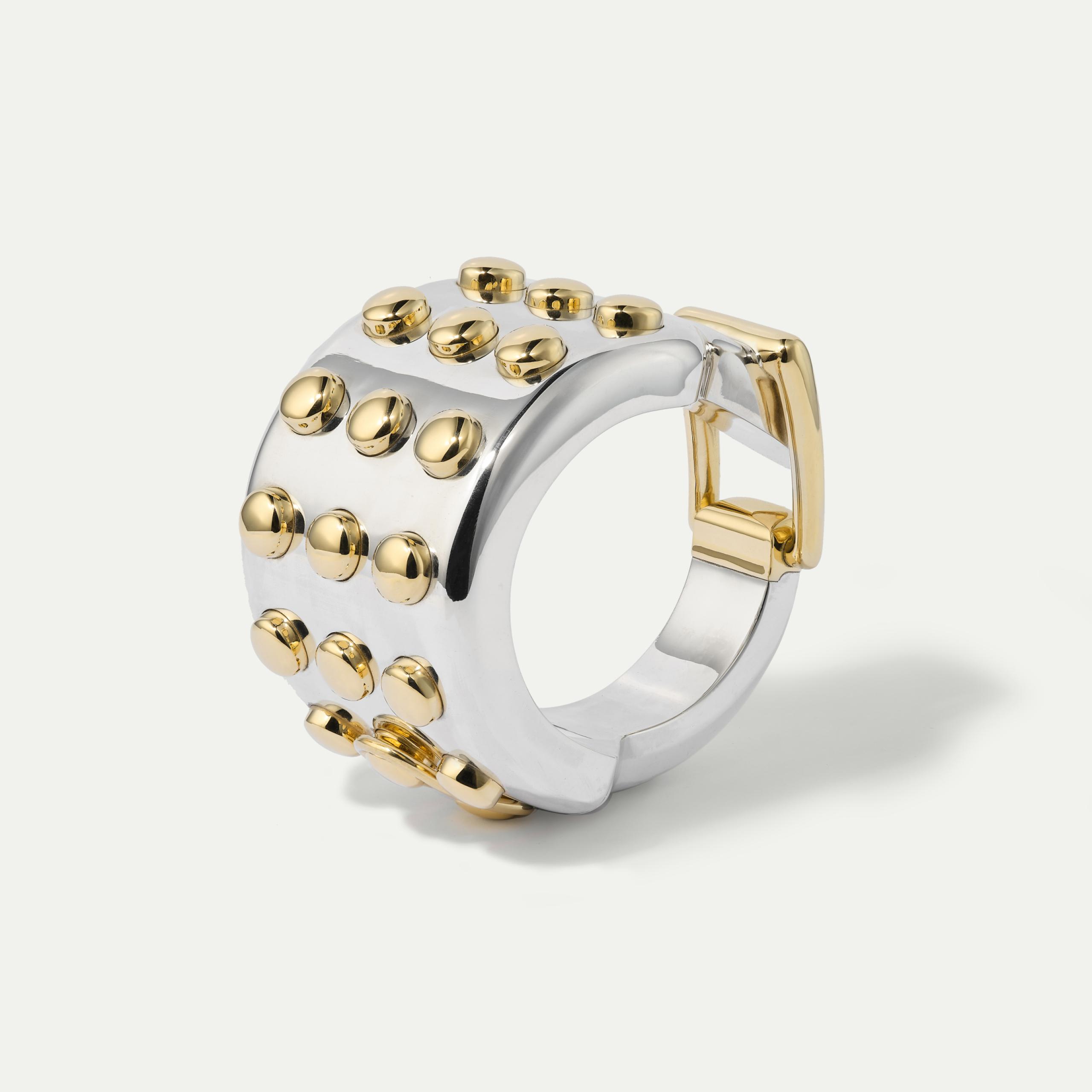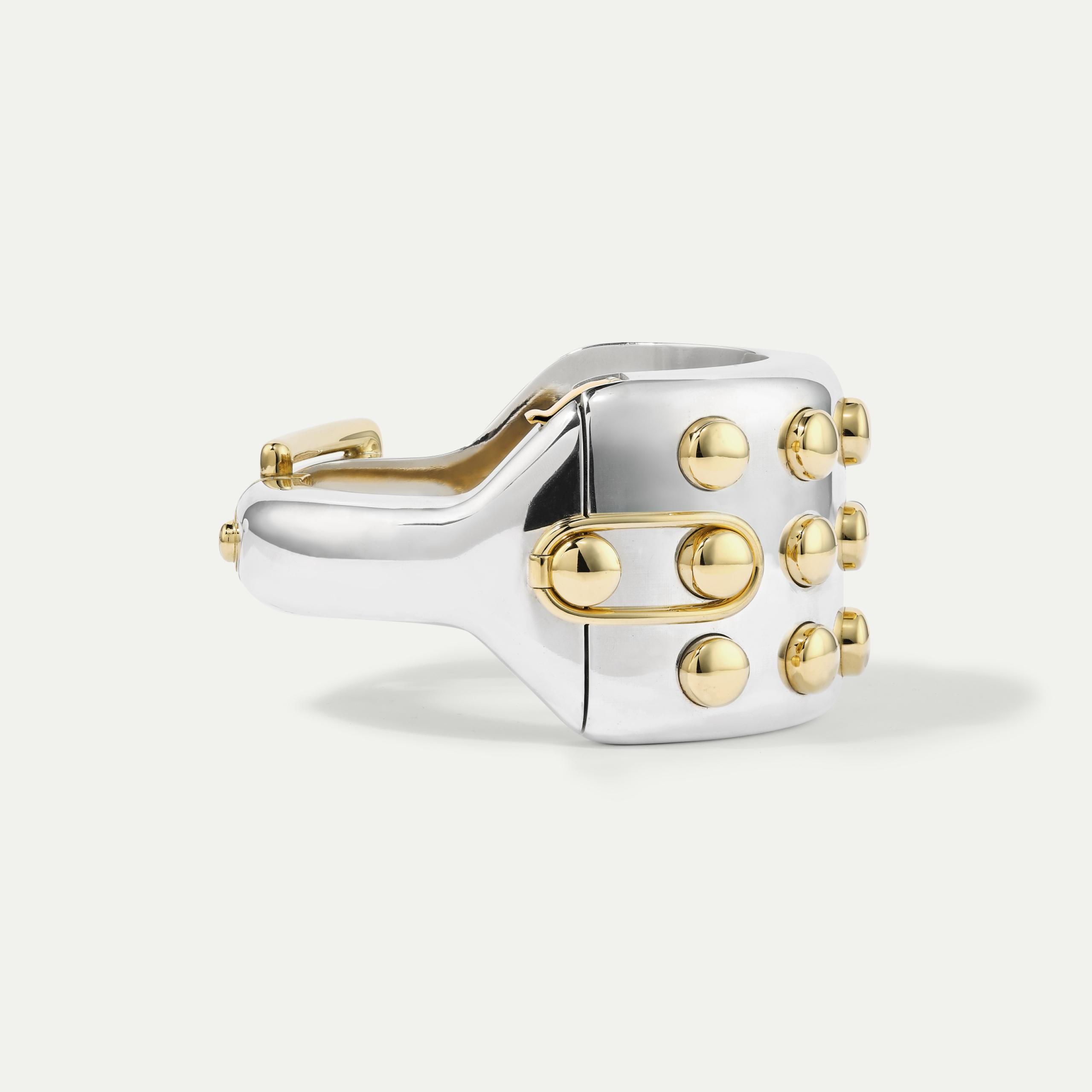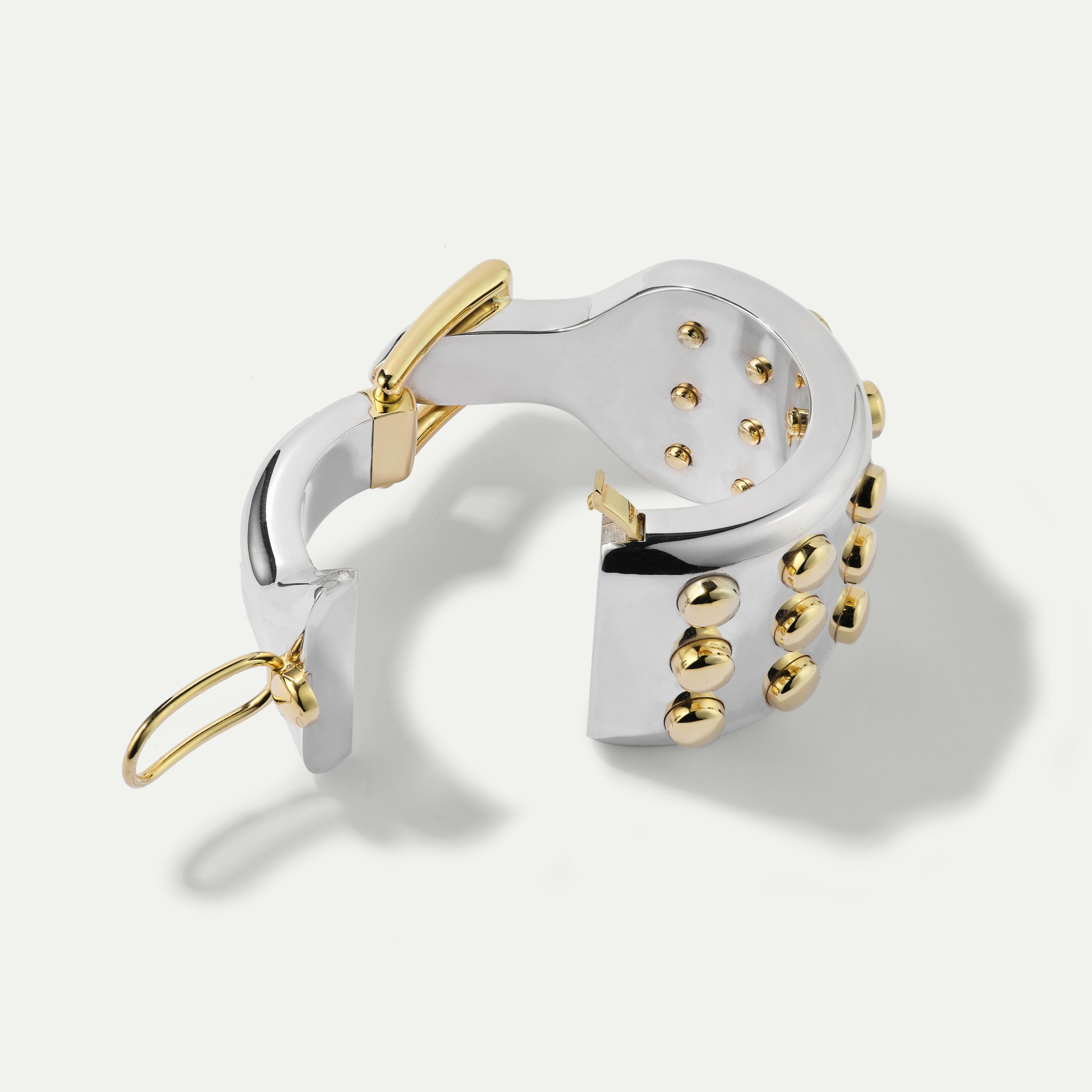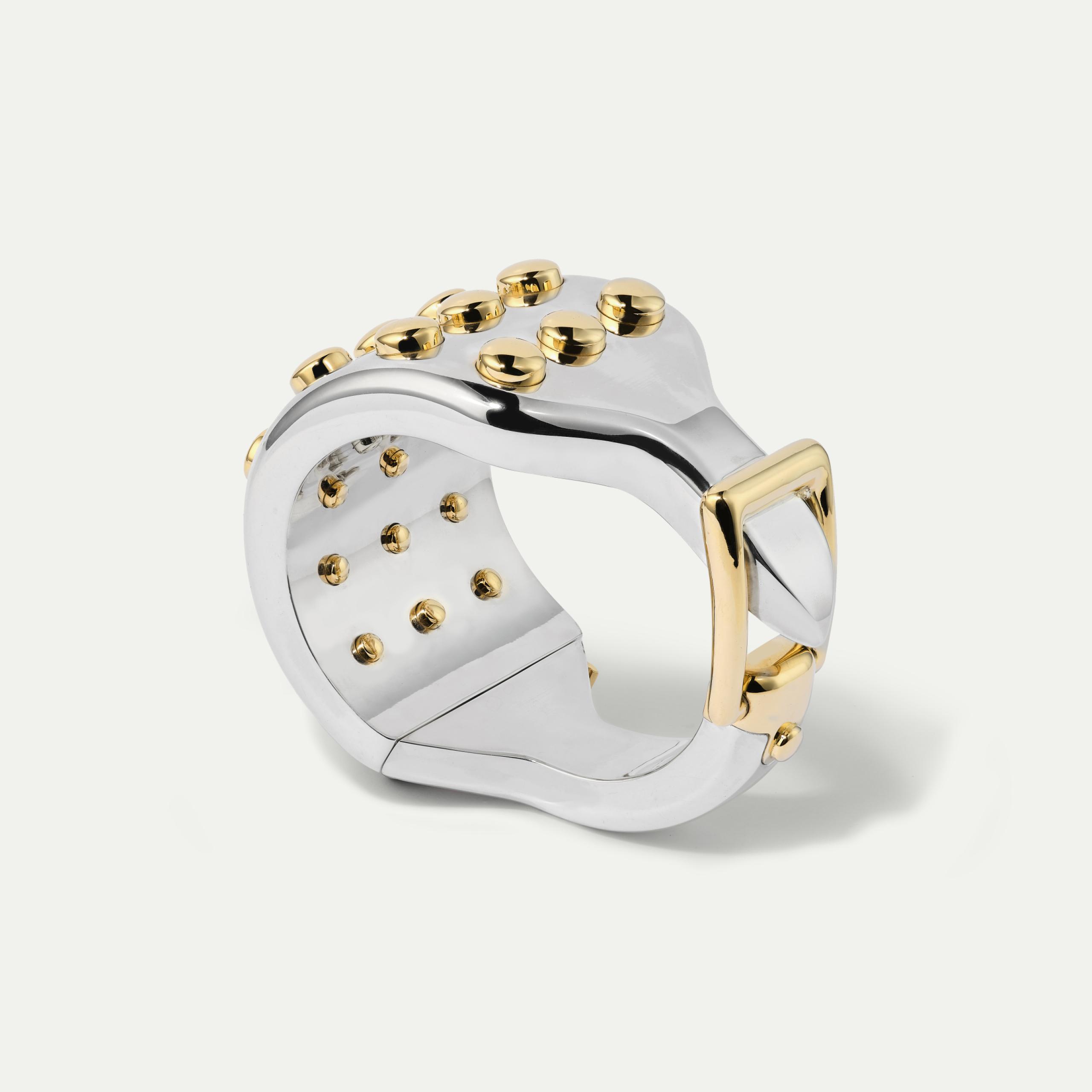 A striking and powerfully substantial silver cuff, inspired by punk-era leather bracelets and punctured by glossy yellow gold studs, embodying hard-edged, machine-age glamour.
