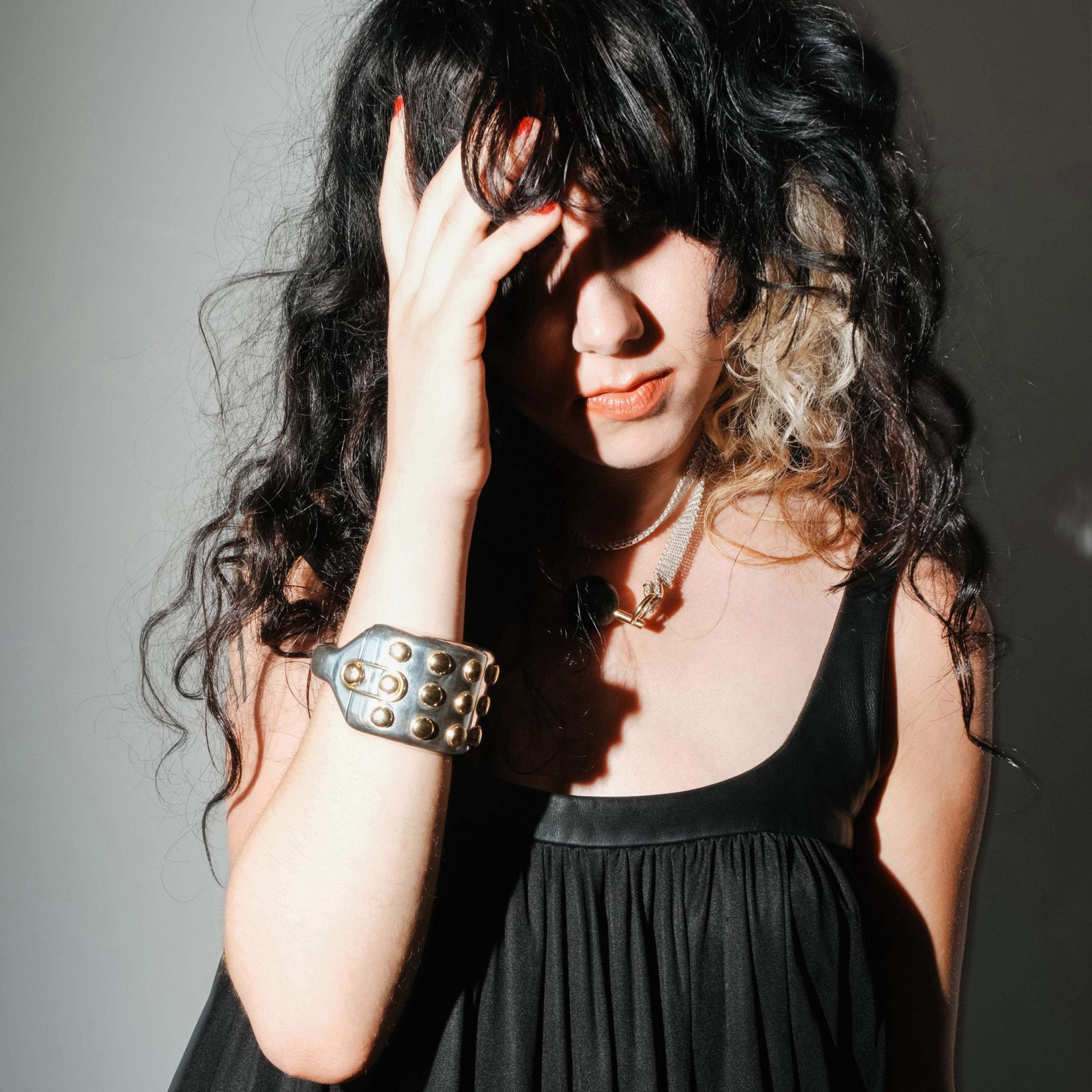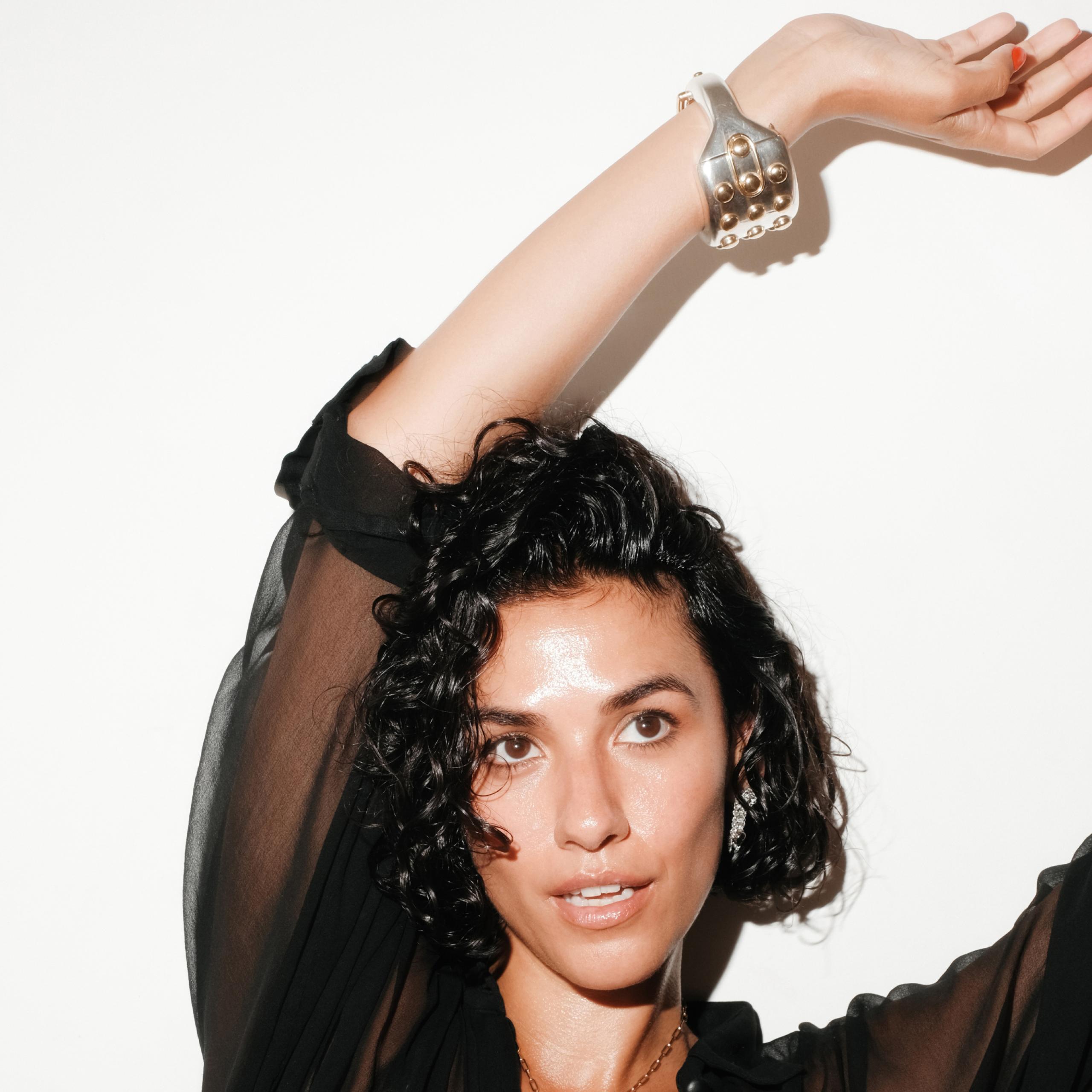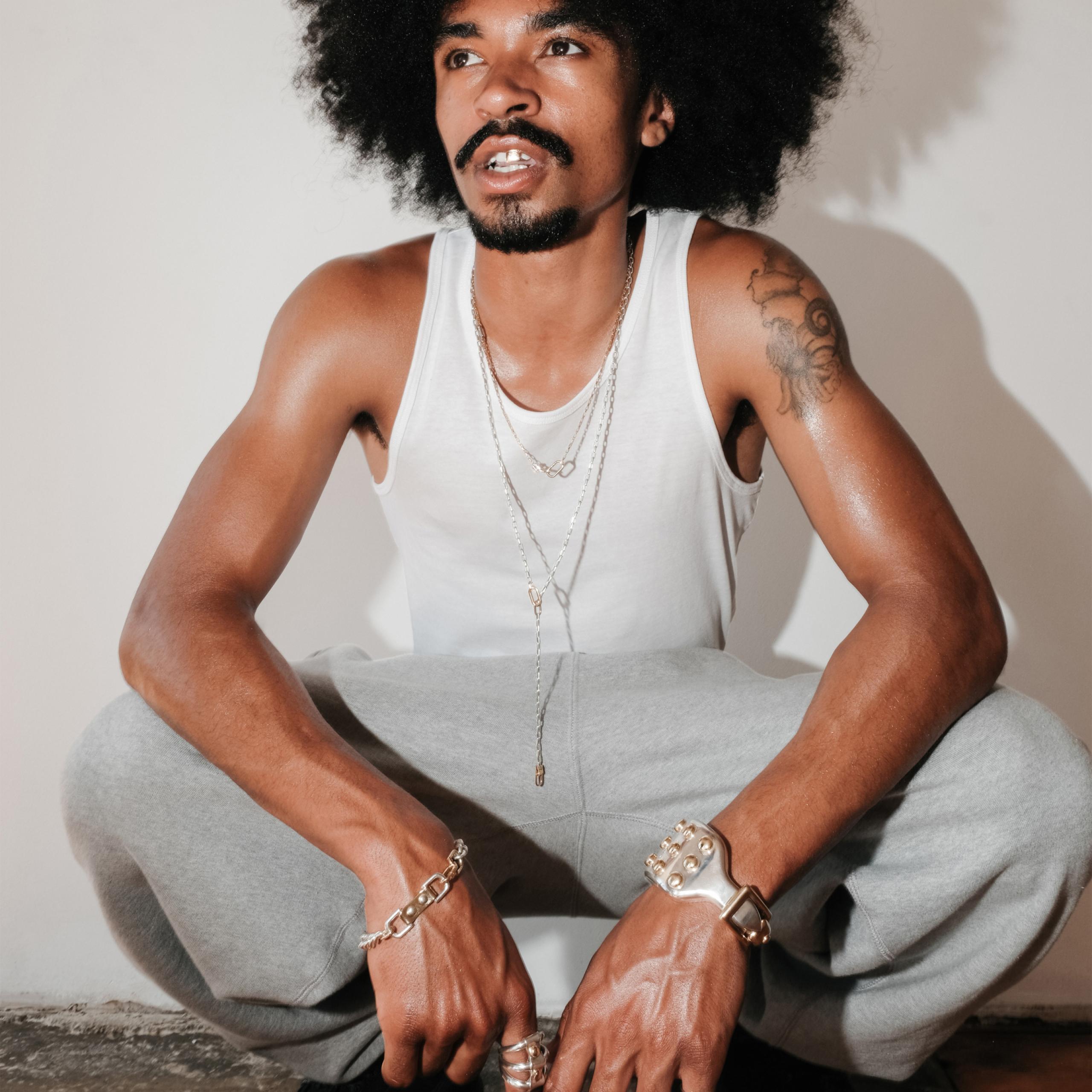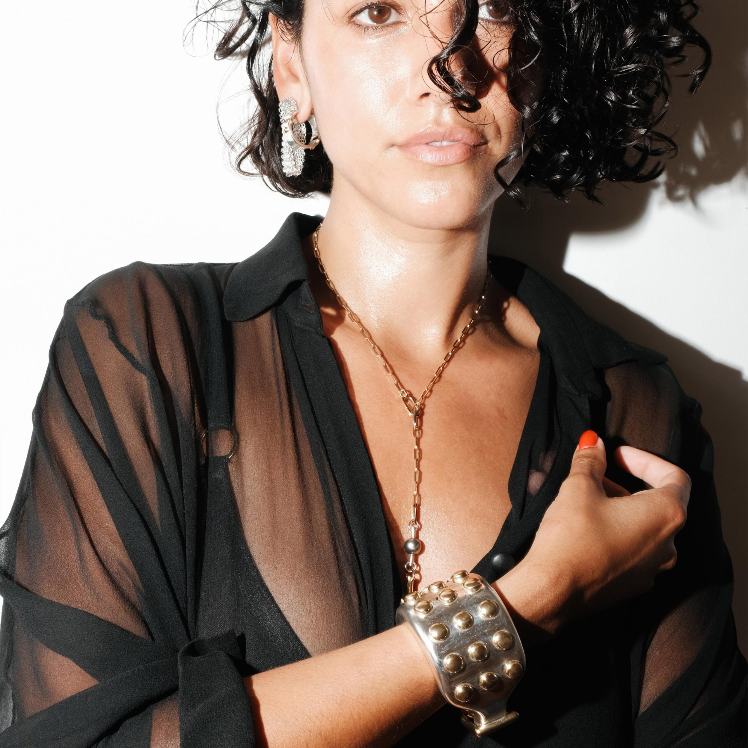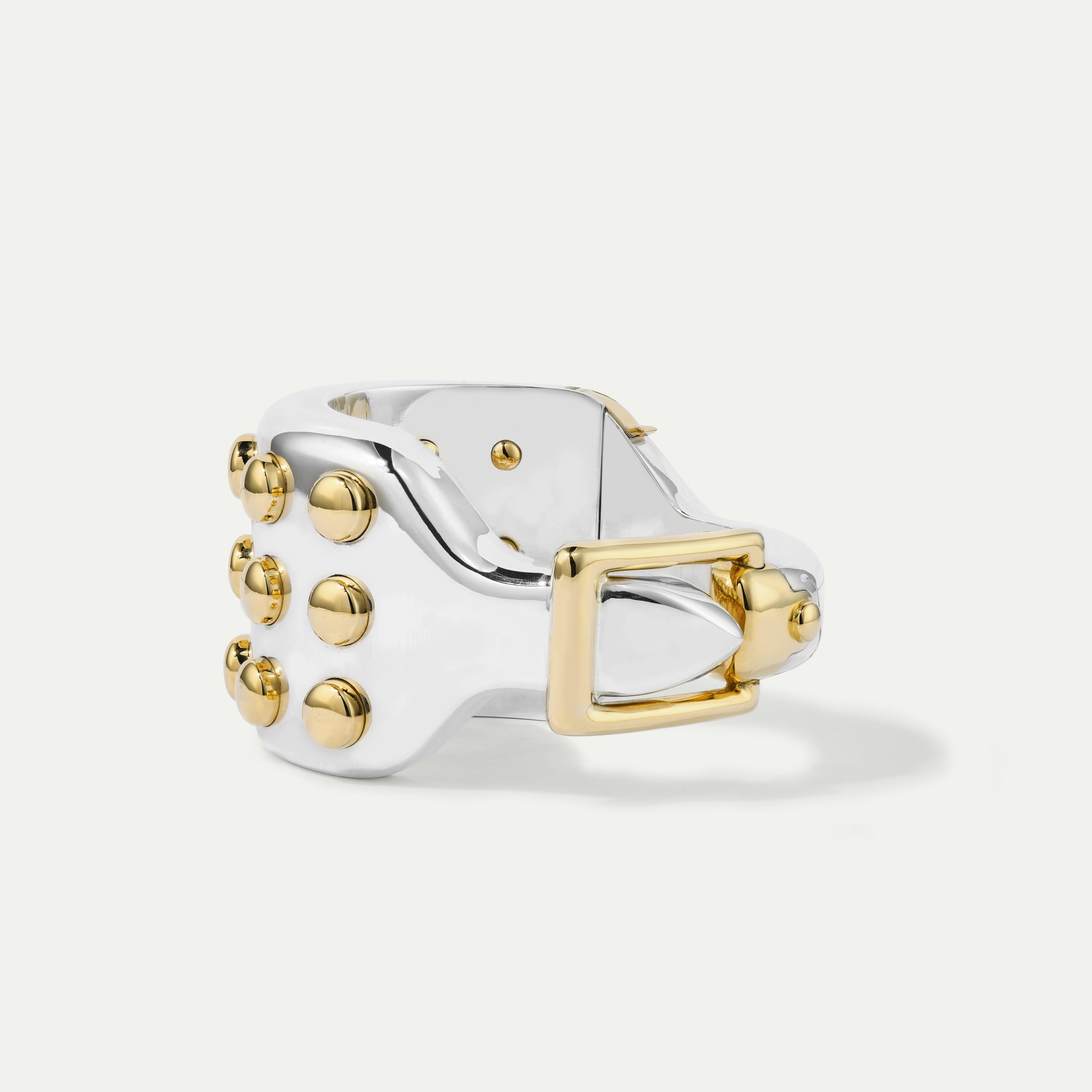 A striking and powerfully substantial silver cuff, inspired by punk-era leather bracelets and punctured by glossy yellow gold studs, embodying hard-edged, machine-age glamour.