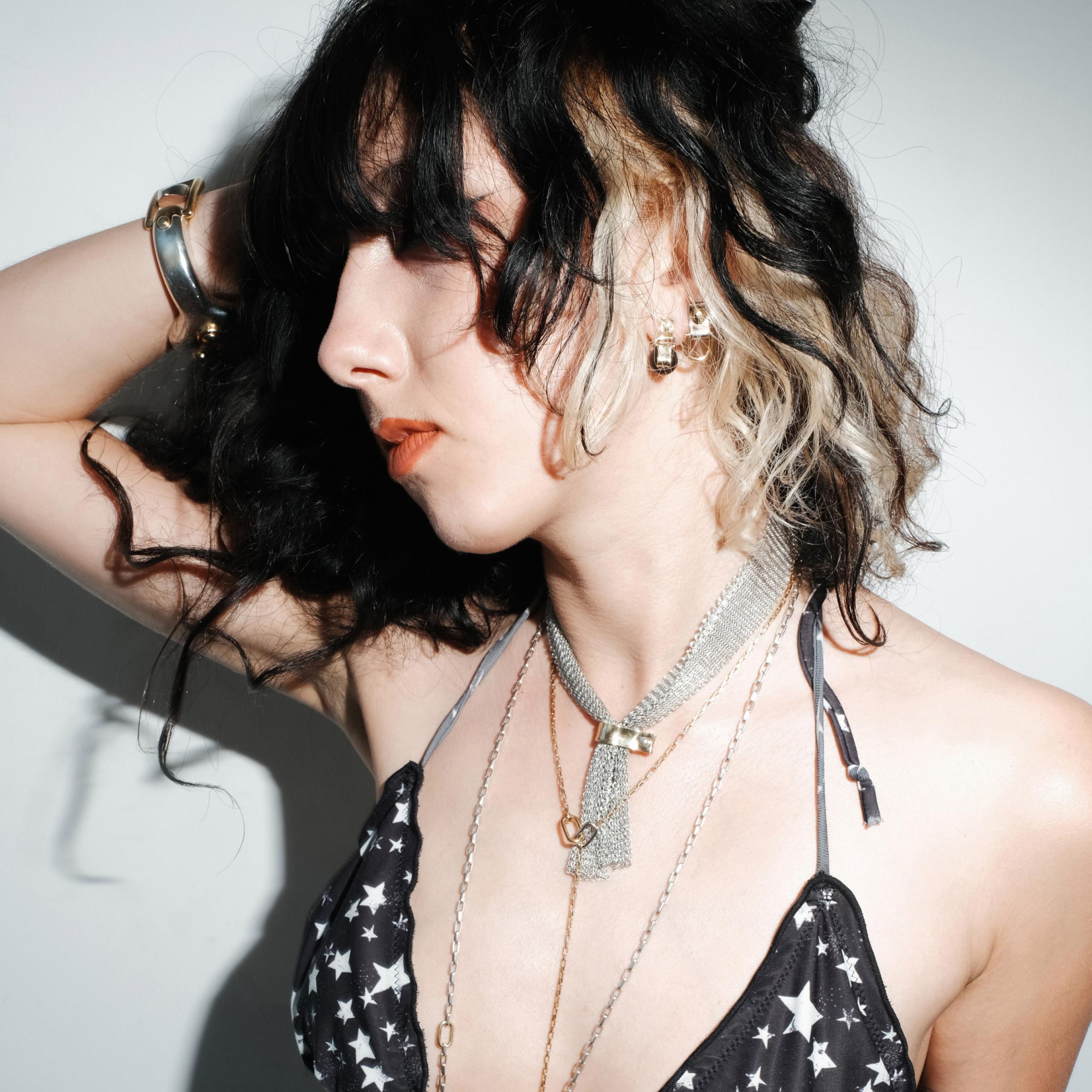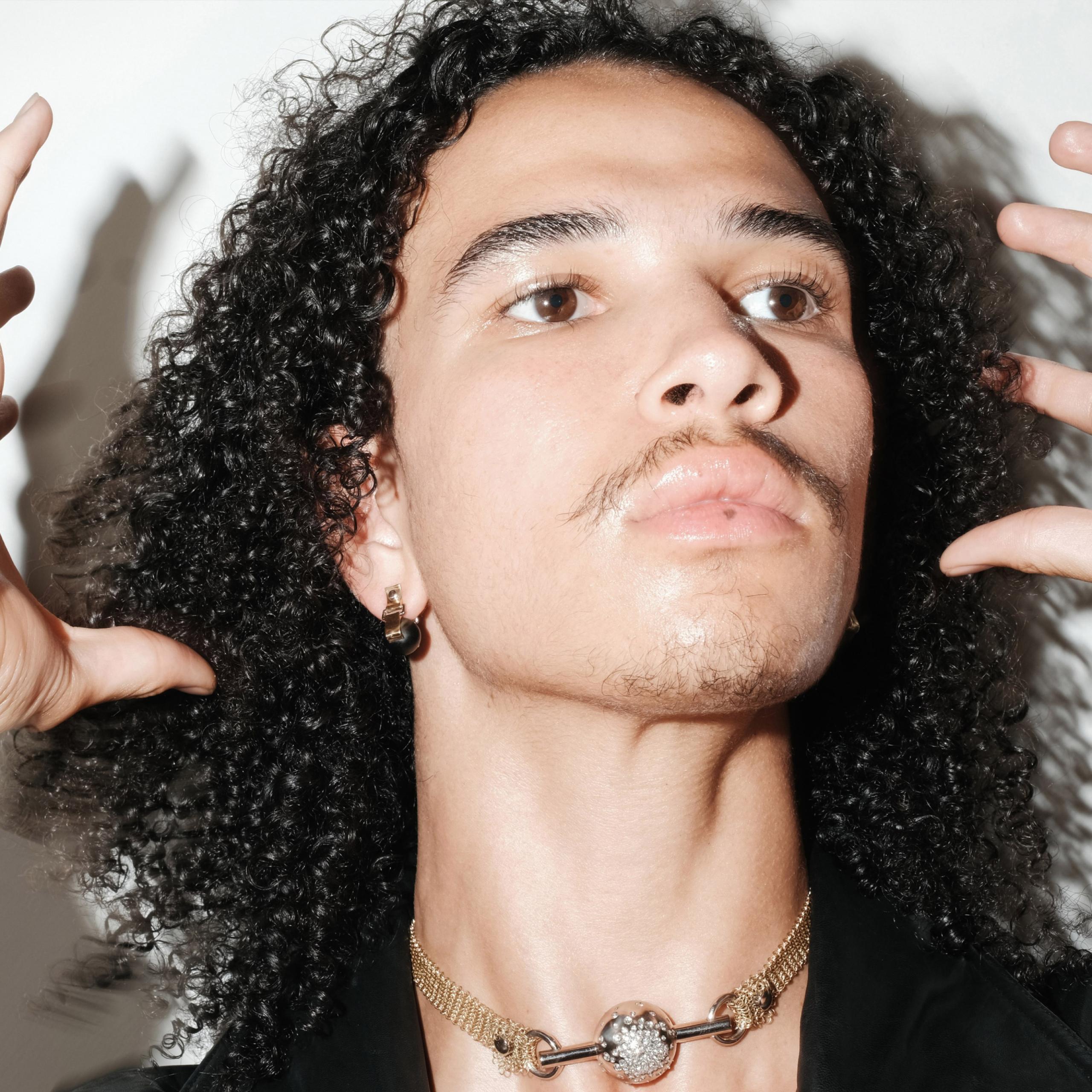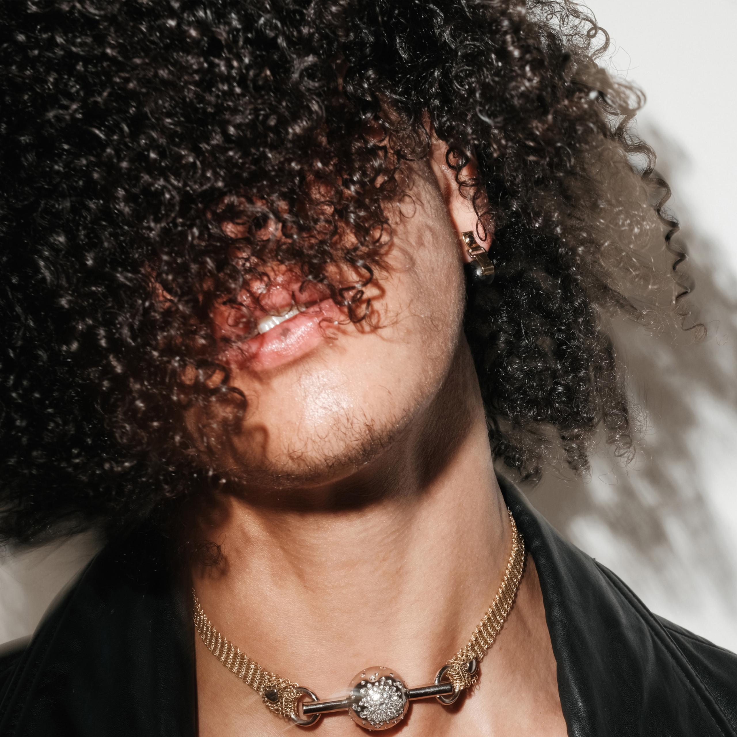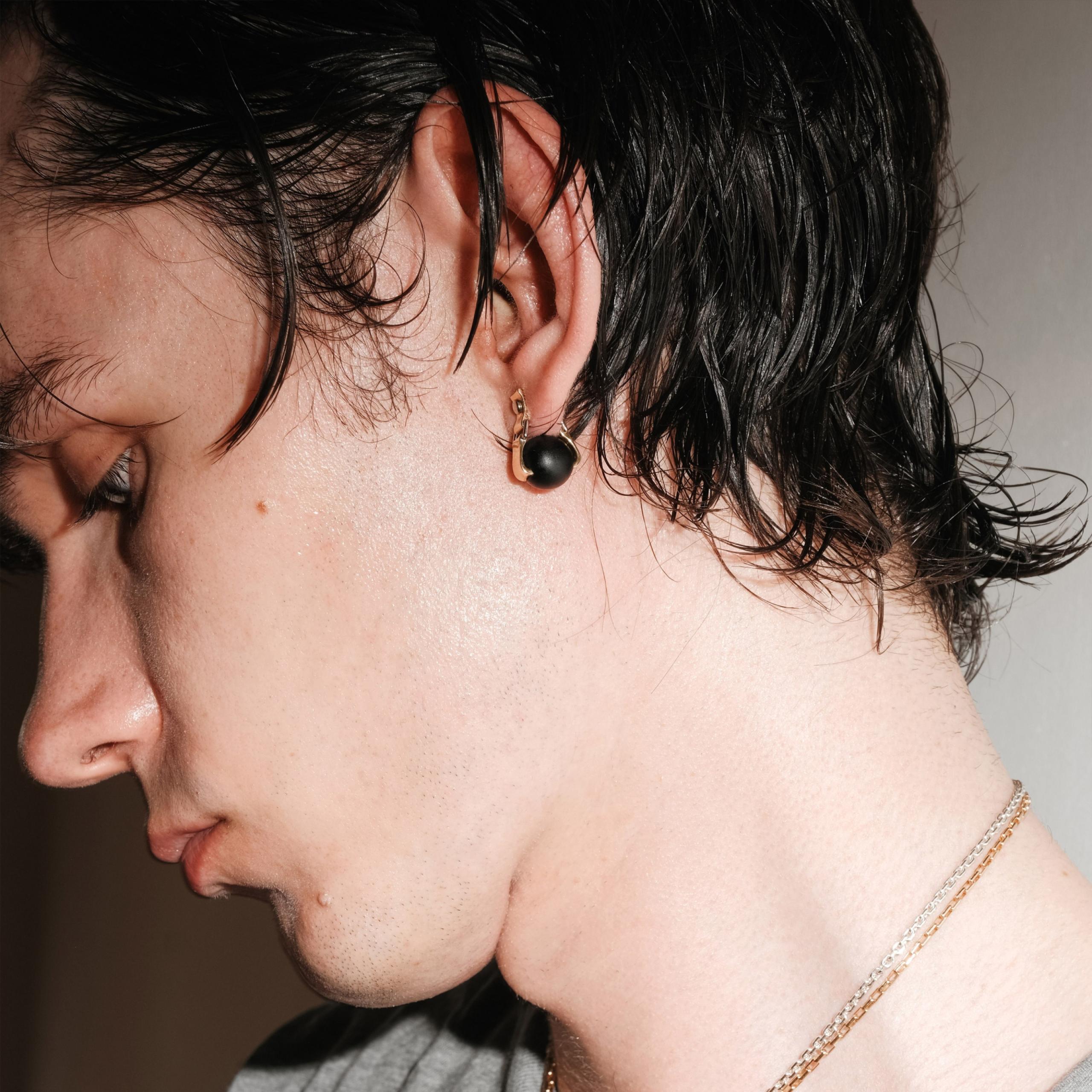 A richly dark orb of ebony, strapped by 18 carat gold, is suspended tantalisingly just below the ear lobe. Sensual and subversive with steely flashes of white gold in the industrial detailing.
