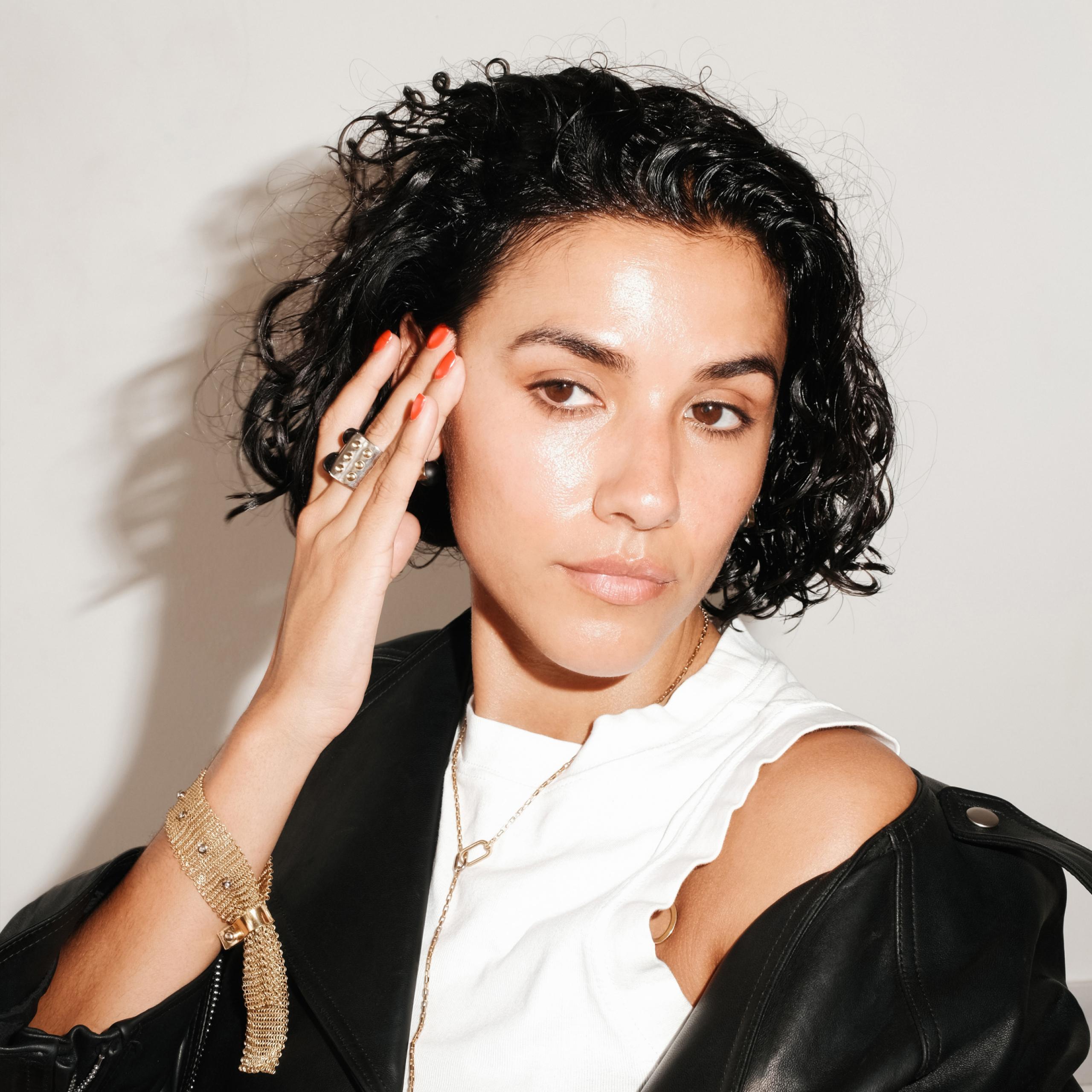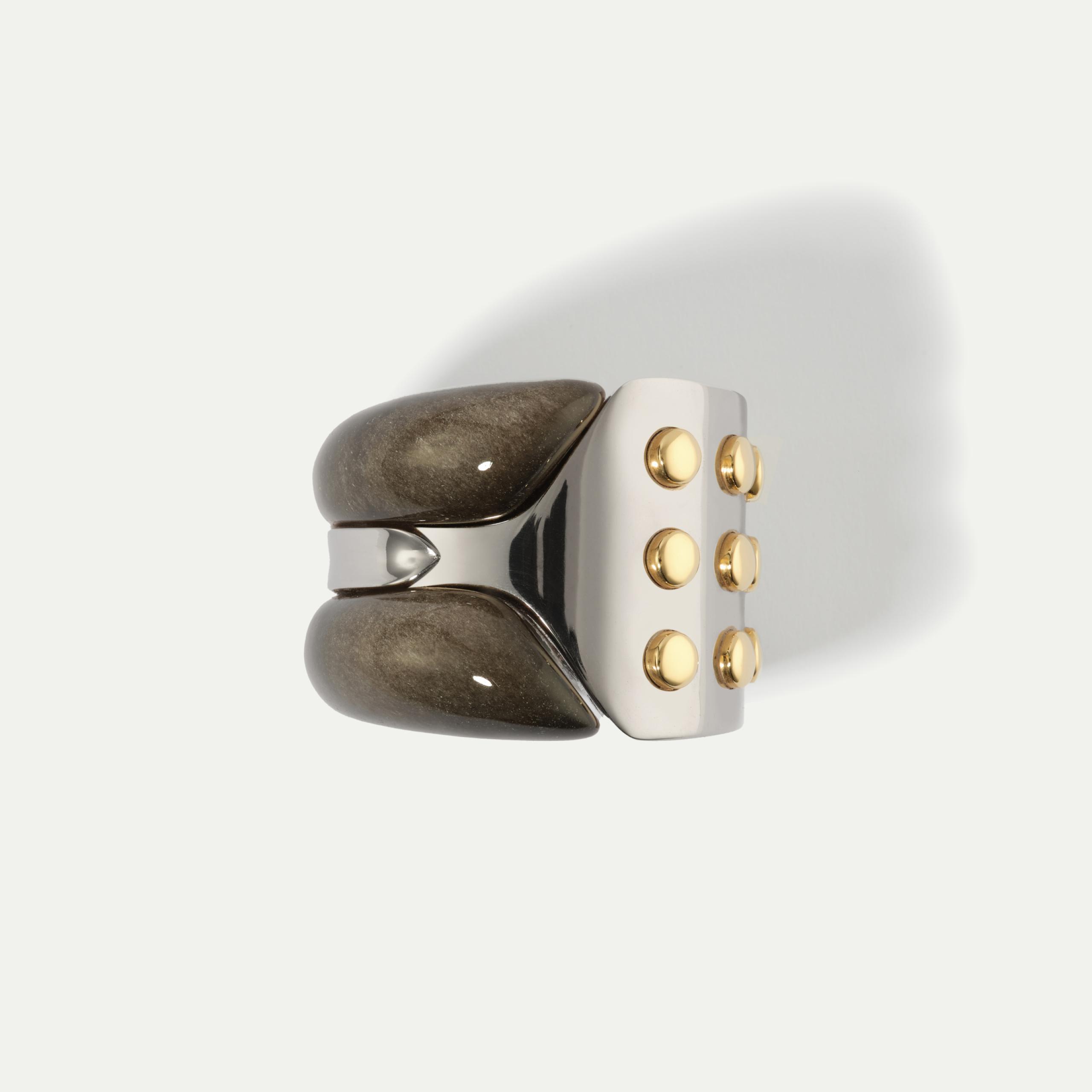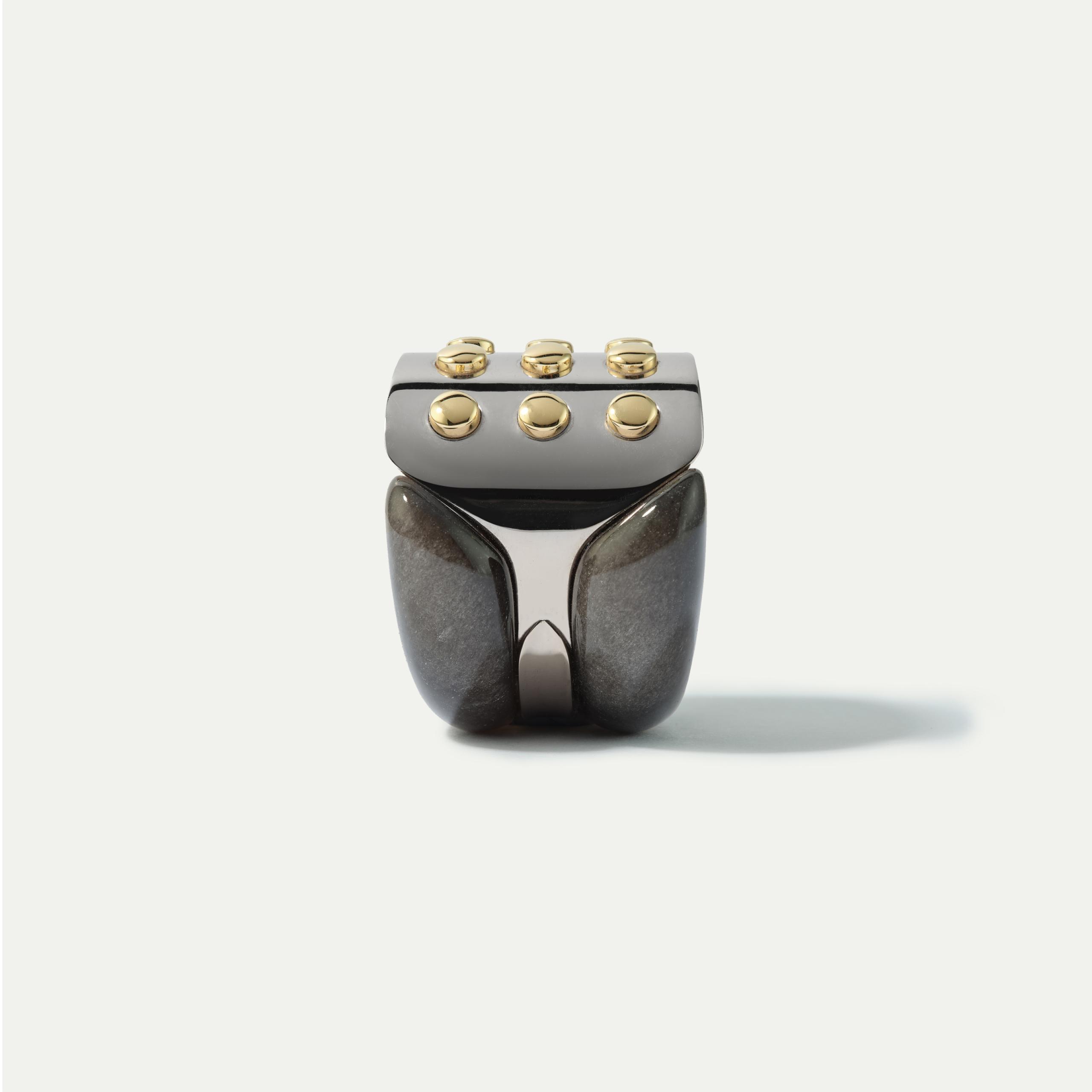 Radical yet wearable and irresistibly tactile. Mesmerizing obsidian oozes from beneath a studded strap of white and yellow gold. A ring steeped in the tension between hard and soft, freedom and restriction, it begs to be touched.